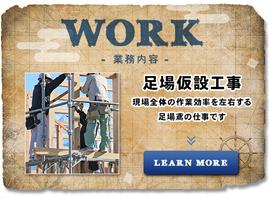現在は戸建て・マンション・ビル・商業施設・店舗・学校や病院などの公共施設・工場など、さまざまな建物の足場仮設工事に携わっております。私どもの足場を利用する職人さんたちに「使いやすかった」とご満足いただけることが、私たちの喜びです。
